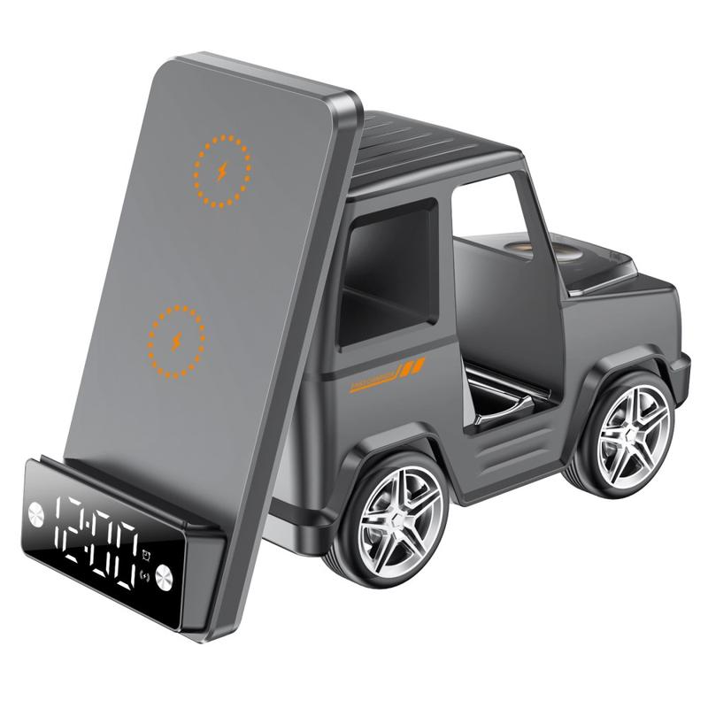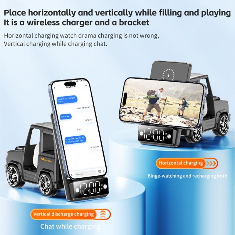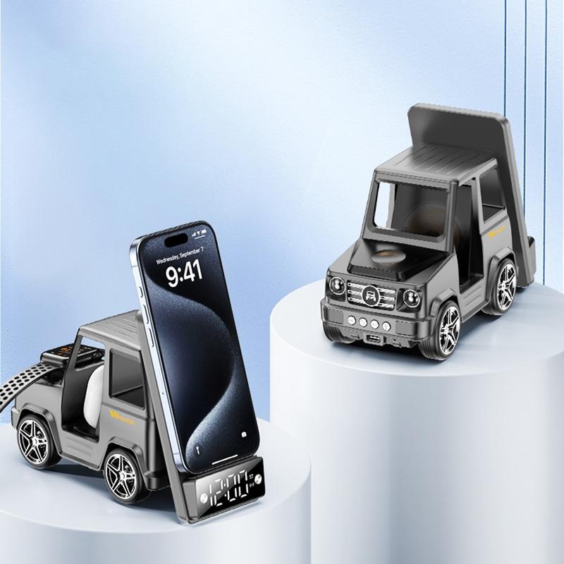 Revolutionieren Sie Ihren Arbeitsbereich mit dem G63 Car-Shaped Wireless Charger. Dieses multifunktionale Gerät mit 15W kabelloser Schnellladung versorgt Ihr Smartphone, Ihre Smartwatch und Ihre Kopfhörer gleichzeitig mit Strom. Der integrierte Bluetooth-Lautsprecher liefert hochwertigen Sound, während die integrierte Uhr mit Weckfunktion Ihnen hilft, den Zeitplan einzuhalten. Mit seinem einzigartigen Autodesign und der Umgebungsbeleuchtung verleiht es Ihrem Schreibtisch oder Nachttisch einen modernen Touch.