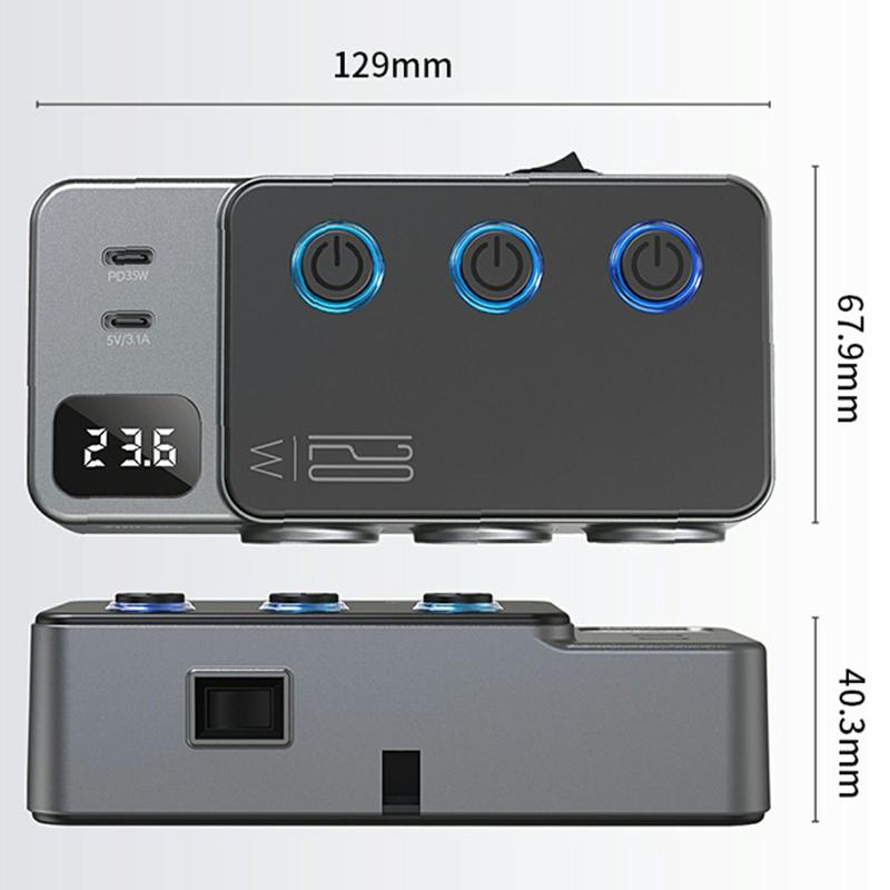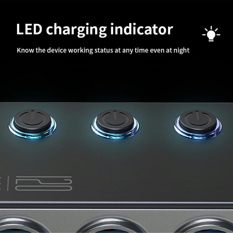 - Insgesamt 7 Ladeanschlüsse - umfasst 3 Zigarettenanzünderbuchsen, 3 USB-A-Anschlüsse, 1 USB-C und 1 PD-Schnellladeanschluss