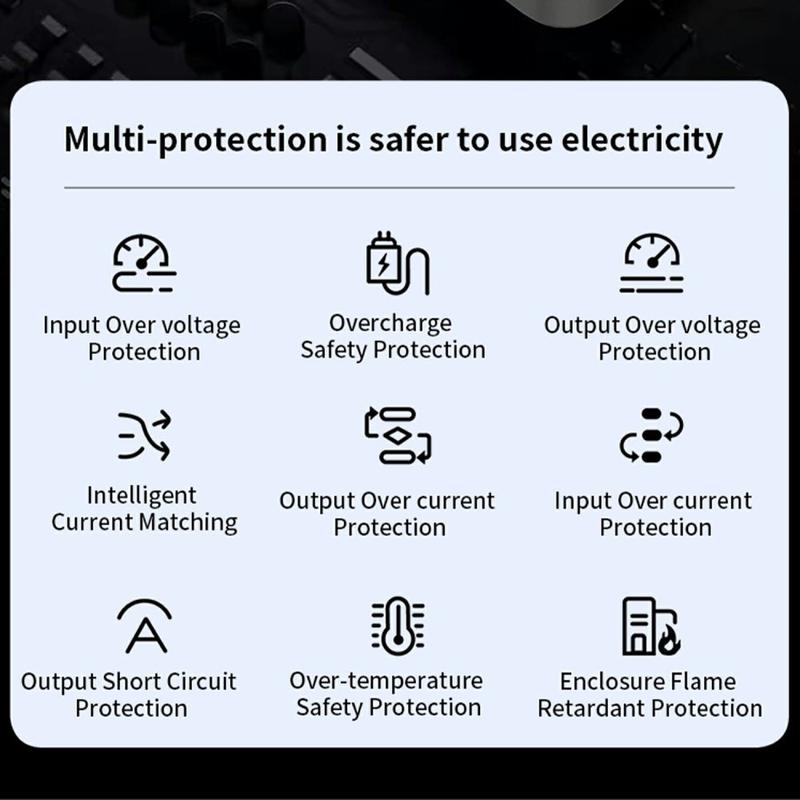 - Intelligentes Laden - Intelligente IC-Technologie gewährleistet sicheres und effizientes Laden mit Überstrom-, Überspannungs- und Kurzschlussschutz