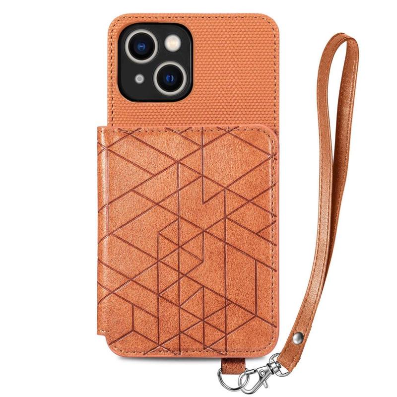 • Kickstand Case with Strap for iPhone 14 Plus, Geometry Imprinted Wallet Car Mount Metal Sheet Leather Coated TPU Phone Cover