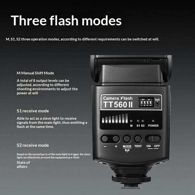 Der GODOX TT560 II verfügt über einen integrierten 433-MHz-Funkempfänger, der die Auslösung von ein bis drei externen Blitzgeräten mit 16 verfügbaren Kanälen und einer Reichweite von bis zu 15 m ermöglicht. Dies macht ihn nützlich für Porträtaufnahmen, Produktfotografie, kreative Innenbeleuchtung und andere Szenarien, in denen eine flexiblere Platzierung des Blitzes erforderlich ist. Es werden drei Blitzmodi unterstützt: Manuell (M), optischer Slave (S1) und Vorblitz-Ignorieren (S2), was Ihnen mehr Optionen für unterschiedliche Lichtverhältnisse und Aufnahmestile bietet.