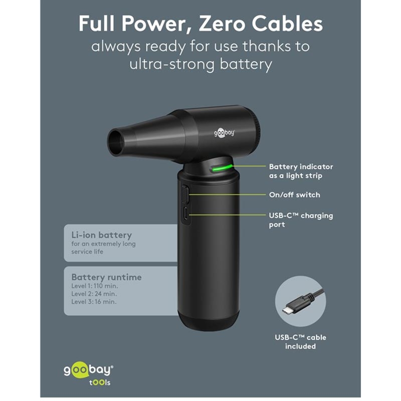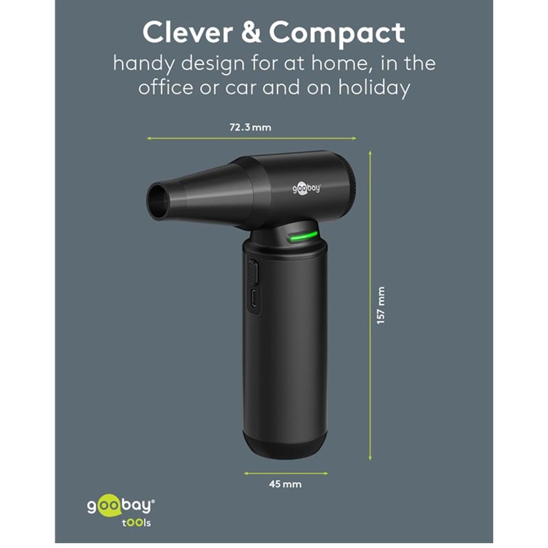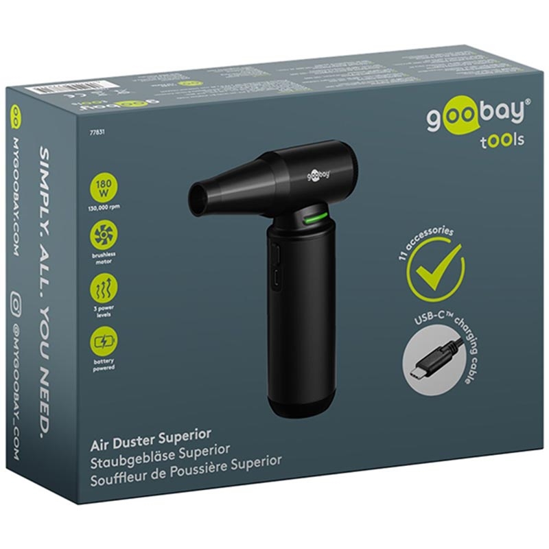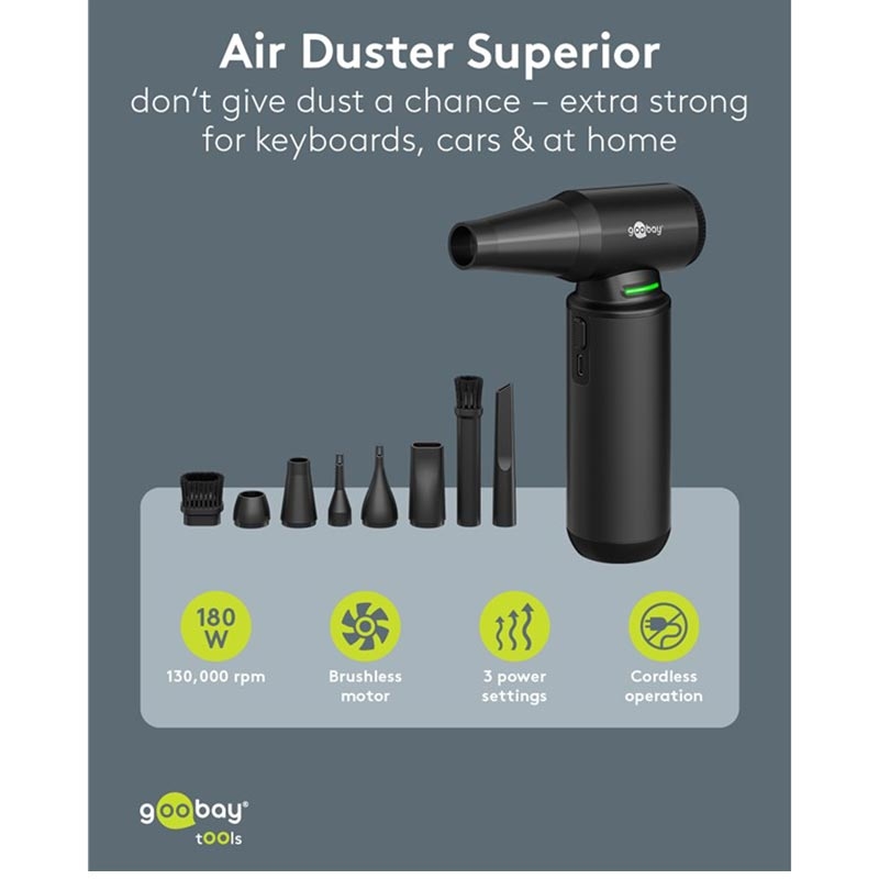 Goobay Druckluftgerät Superior - Schnurloses Elektrogebläse mit 130000 U/min, 8 Düsen und 3 Bürsten (180 W, Aluminium Design)