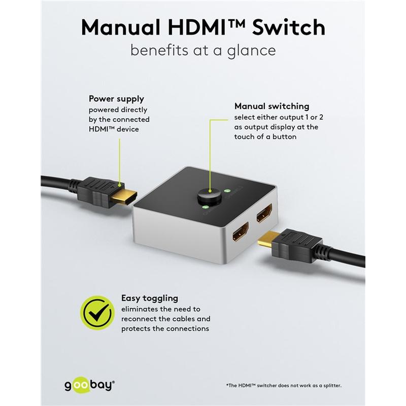 Dubbelriktad HDMI™-switch som dirigerar 1x HDMI™-ingångssignal till 2x HDMI™-enheter, t.ex. bildskärmar, eller alternativt 2x ingångssignaler till 1x terminal. HDMI™-distributör 2 in 1 ut stöder 3D och upplösningar upp till 4K @ 60 Hz och är HDCP-kompatibel, En knapp väljer antingen utgång 1 eller 2 som utgångsdisplay. Bekväm omkoppling på HDMI™-switchen gör att du slipper koppla om kablar och skyddar anslutningarna. Lämplig t.ex. för att ansluta Blu-ray-spelare, SAT/TV-mottagare, datorer, surfplattor, spelkonsoler som PS4 eller Xbox till en TV, monitor eller projektor, HDMI™ switchbox 2x1 fungerar direkt via den anslutna HDMI™-enheten utan extern strömförsörjning. Observera: HDMI™-switchen är inte en splitter!