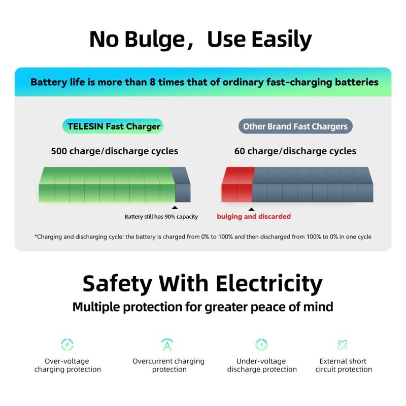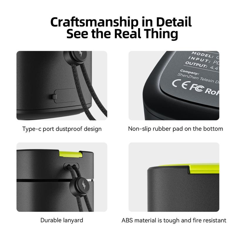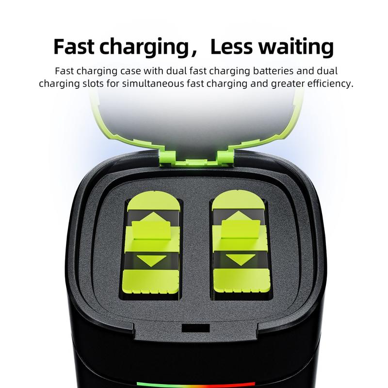 Lassen Sie sich niemals durch einen leeren Akku von Ihrem Abenteuer abhalten! Die TELESIN GP-FCK-B11 2-Slot Battery Charger & Storage Box wurde für GoPro Hero 11 Benutzer entwickelt, die eine schnelle, effiziente und sichere Ladelösung benötigen. Dieses kompakte und reisefreundliche Ladegerät kann zwei Akkus gleichzeitig aufladen und verfügt über eine Schnellladefunktion, die den Akku in nur 30 Minuten auf 75 % auflädt, damit Sie immer bereit sind, die Action einzufangen.