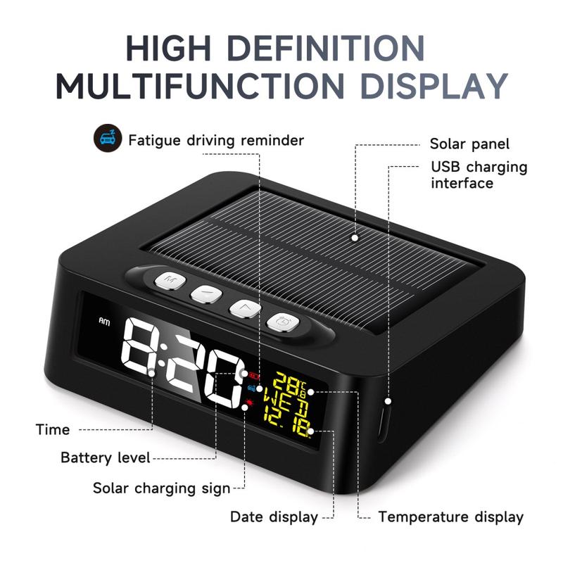 Sie erhalten eine tragbare Uhr, die mit Solarenergie oder USB-Typ-C-Aufladung betrieben wird und somit zu Hause und unterwegs zuverlässig funktioniert. Die Ermüdungsanzeige bietet einen praktischen Sicherheitsvorteil für Autofahrer.