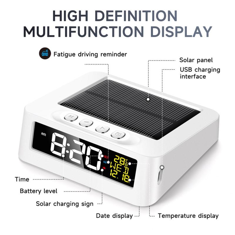 Sie erhalten eine tragbare Uhr, die mit Solarenergie oder USB-Typ-C-Aufladung betrieben wird und somit zu Hause und unterwegs zuverlässig funktioniert. Die Ermüdungsanzeige bietet einen praktischen Sicherheitsvorteil für Autofahrer.