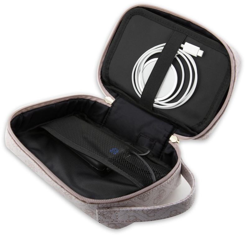 Die Guess Travel Universal Tasche ist der ideale Reisebegleiter für alle, die eine stilvolle und praktische Möglichkeit suchen, ihr gesamtes Zubehör für Telefon, Tablet oder Laptop mitzunehmen. Die aus hochwertigem ECO-Leder gefertigte Tasche verfügt über eine fein strukturierte Oberfläche, die mit dem kultigen Guess-Logo verziert ist. Im Inneren bieten gut durchdachte Fächer ausreichend Platz für Ladegeräte, Powerbanks und Stromkabel. Das Besondere an dieser Tasche ist der USB-A-Ausgang, über den Sie eine Powerbank anschließen und Ihr Handy direkt an der Seite der Tasche aufladen können. Mit ihrem klaren Design und ihrem Sinn für Stil ist diese Tasche perfekt für Reisende, die Wert auf Funktionalität und Mode legen.