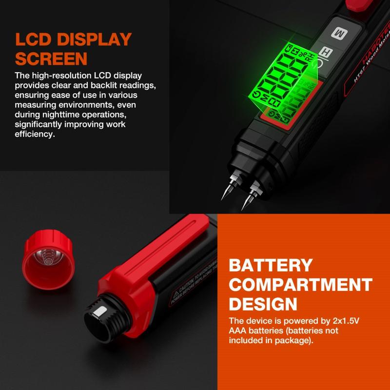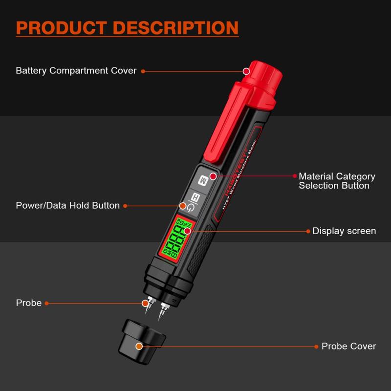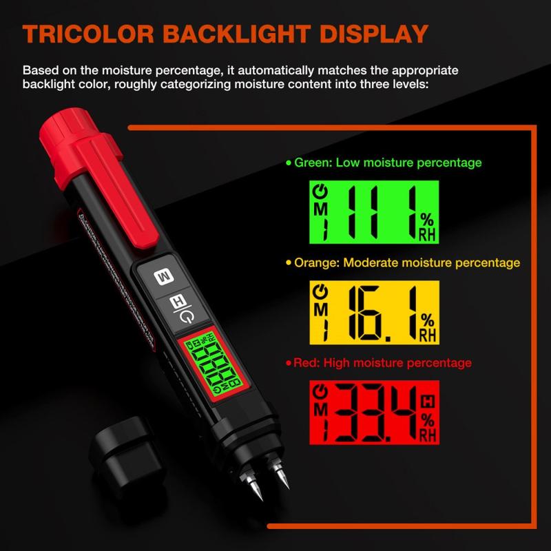 Das stiftförmige Gehäuse erleichtert den Transport und den Einsatz vor Ort, während die Edelstahlsonden für regelmäßige Messungen auf verschiedenen Oberflächen ausgelegt sind. Ein dreifarbiges LCD-Display mit Hintergrundbeleuchtung sorgt zudem für eine bessere Lesbarkeit der Ergebnisse und zeigt den Feuchtigkeitszustand auch in dunkleren Umgebungen auf einen Blick klarer an.