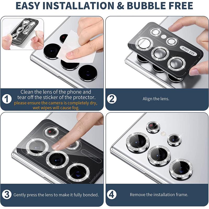 Dieser Kameraschutz besteht aus hochwertigem gehärtetem Glas mit einer Härte von 9H, das unter einem robusten Ring aus einer Aluminiumlegierung angebracht ist, der mit glänzenden Strasssteinen verziert ist. Es ist genau gefertigt, um perfekt die Kameralinsen auf Ihrem Samsung Galaxy S23 Ultra 5G, mit hoher Transparenz passen, so dass es nicht die Qualität der aufgenommenen Bilder und Videos beeinflussen wird.