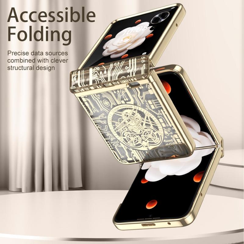 Das Mechanical Legend Series Case für Honor Magic V Flip kombiniert hervorragenden Schutz mit elegantem Design. Diese galvanisierte PC-Telefonhülle mit Bildschirmfolie bietet einen umfassenden Schutz vor Kratzern, Stürzen und täglicher Abnutzung. Das stilvolle Finish verleiht Ihrem Gerät einen Hauch von Eleganz und macht es sowohl funktional als auch modisch.