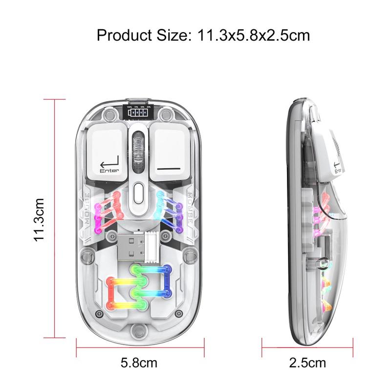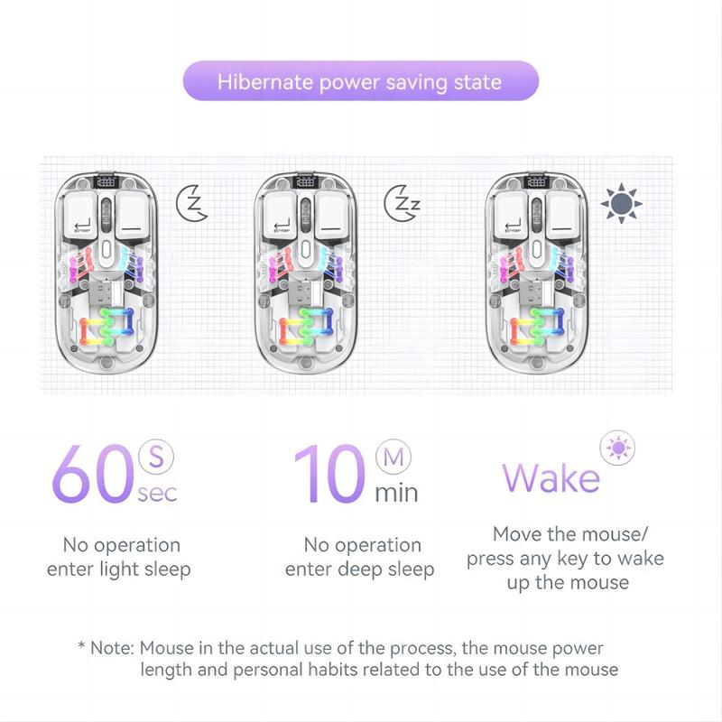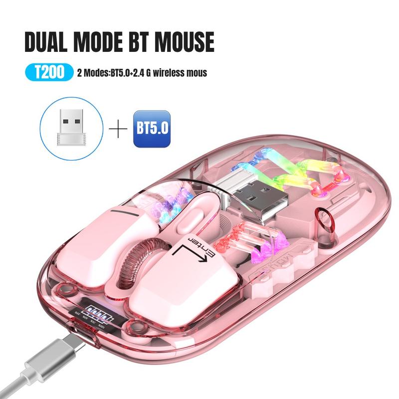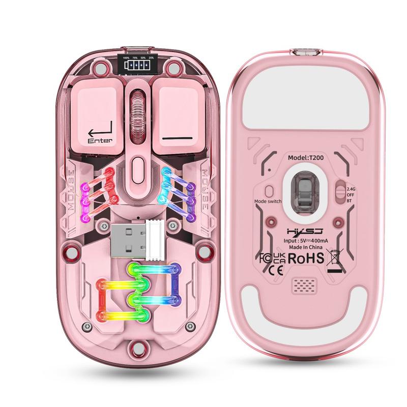 Die kabellose Bluetooth-Maus HXSJ T200 bietet doppelte Konnektivität über Bluetooth und 2,4-GHz-Funk und unterstützt die gleichzeitige Verbindung mit zwei Geräten. Die aus transparentem PC-Material gefertigte Maus mit anpassbarer RGB-Beleuchtung bietet ein hochwertiges Aussehen und überlegene Funktionalität. Mit einstellbarer DPI (800/1200/1600), einem langlebigen 400-mAh-Akku und einem schlanken, ergonomischen Design sorgt sie für eine präzise und reibungslose Bedienung. Die Maus eignet sich sowohl für die Arbeit als auch für Spiele und verbessert die Effizienz und den Komfort mit leisen Klicks und lebendiger Beleuchtung.