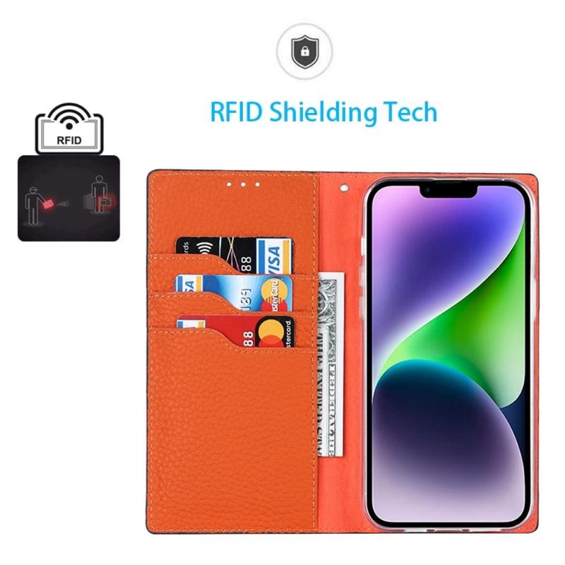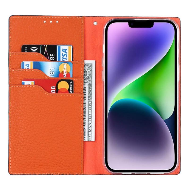 • For iPhone 14 RFID Blocking Card Slot Wallet Phone Case Litchi Texture Genuine Leather Stand Auto-absorbed Protective Cover - Made of genuine leather and TPU material, with litchi texture design, dual protection for your device - Wallet design, easy to organize your cards and cash money for daily use - RFID blocking technology effectively blocks signals and protects your personal information from theft - Supporting stand design is for convenient free-hands use when watching movies or reading - The magnetic auto-absorbed closure keeps all your valuables secure - Raised lip protection keeps the camera lens protected on a flat surface - Provide full body protection against scratches and drops - With a strap to prevent loss and it is convenient to carry