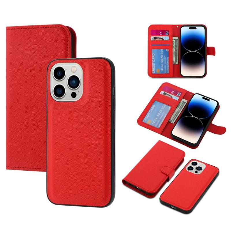 • For iPhone 14 Pro Detachable TPU Back Case Cross Texture PU Leather Drop-proof Cover Flip Stand Wallet Shell This case features a two-in-one design with a PU leather wallet case and a detachable leather coated TPU back shell, which can be attached together by magnetic snap fastener. High quality materials with exquisite workmanship ensure an elegant look and comfortable hand feeling. Moreover, 2 card slots, 1 photo slot and 1 cash compartment inside allow you to carry around your essential ID, credit cards and cash with your phone without having to take an extra heavy wallet. - Cross texture surface, anti-slip, anti-sweat and anti-fingerprint - Premium PU leather and TPU material, good hand feeling - Practical design, combines your wallet and phone case into one handy unit - The magnetic clasp keeps the lid closed and keeps valuables secure - Built-in metal sheet can be attached to magnetic car holder (not included) - Provide full body protection against scratches and drop - Can act as a stand to support your phone
