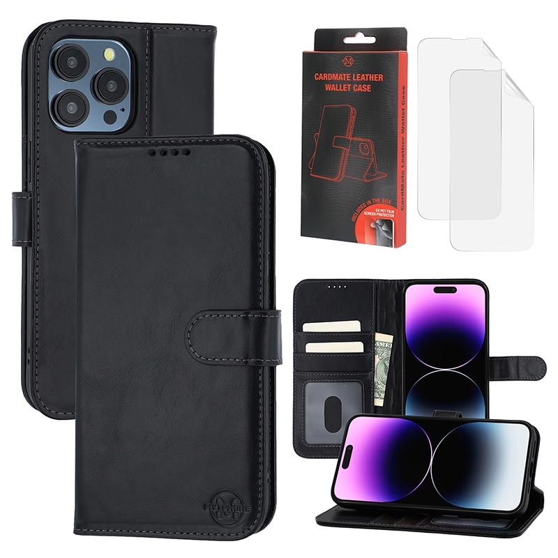 • MyTPhone CardMate Premium Leder Wallet Case für iPhone 14 Pro - Standfunktion, Kartenhalter, Unterstützung für drahtloses Laden, 2x Displayschutzfolie