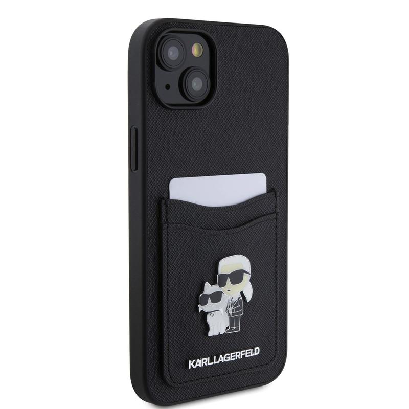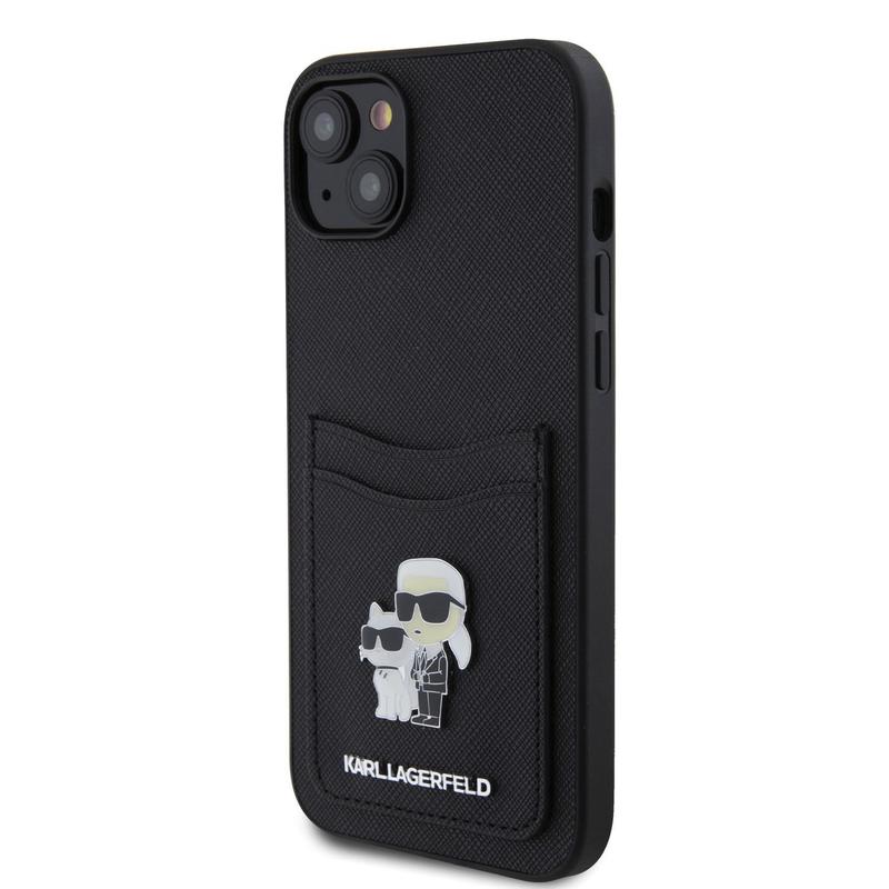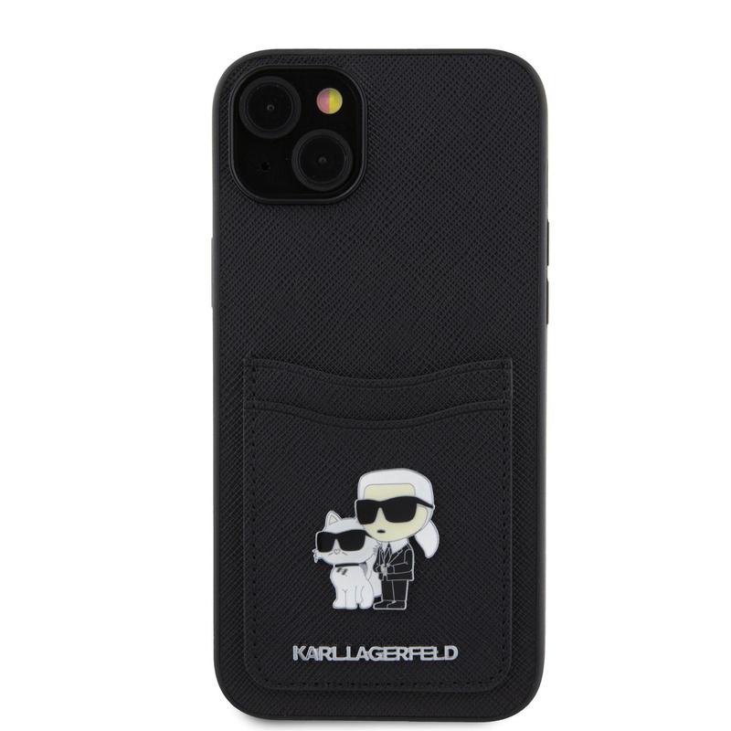 iPhone 15 Karl Lagerfeld Saffiano Kartenschlitz Metall Karl & Choupette Hülle - schwarz