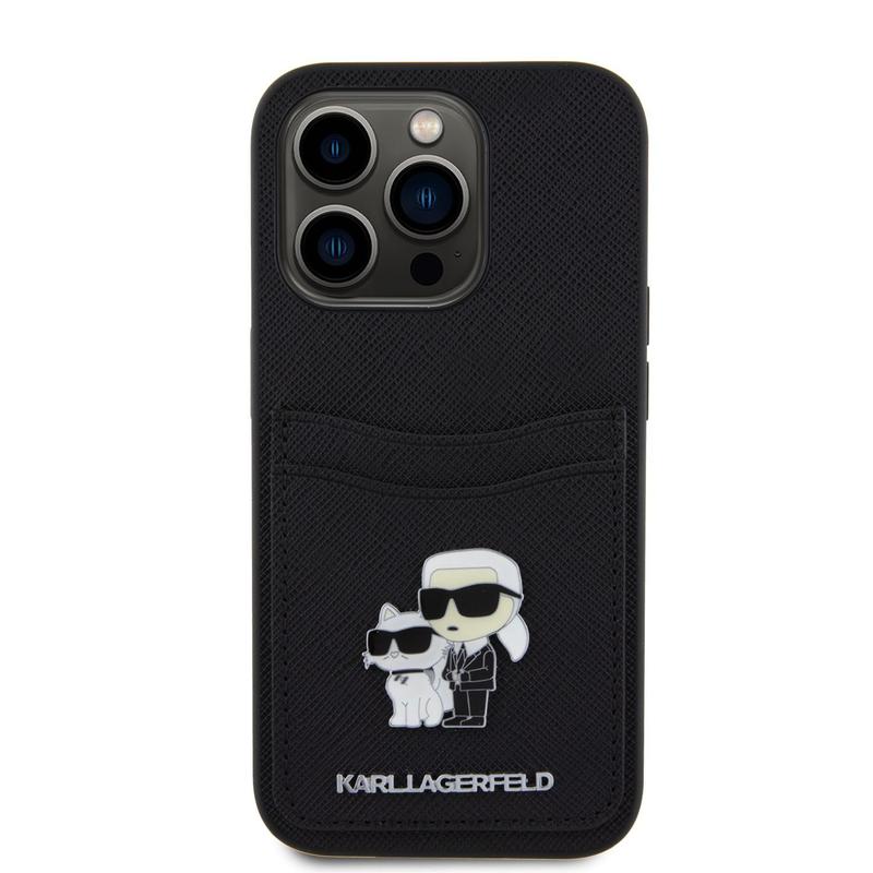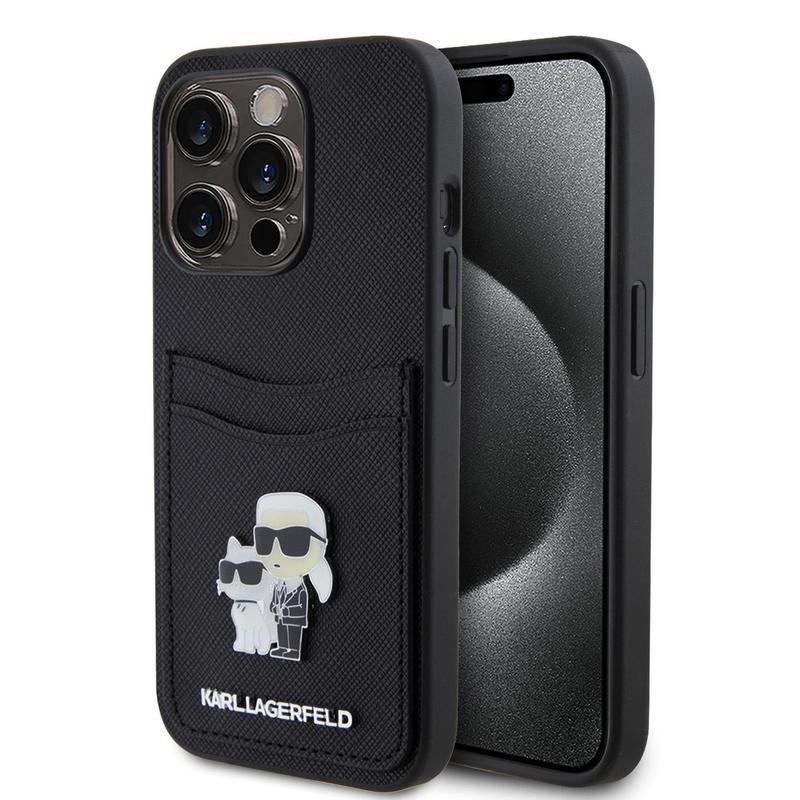 Karl Lagerfeld Saffiano Kartenschlitz Metall Karl & Choupette Hülle für iPhone 15 Pro