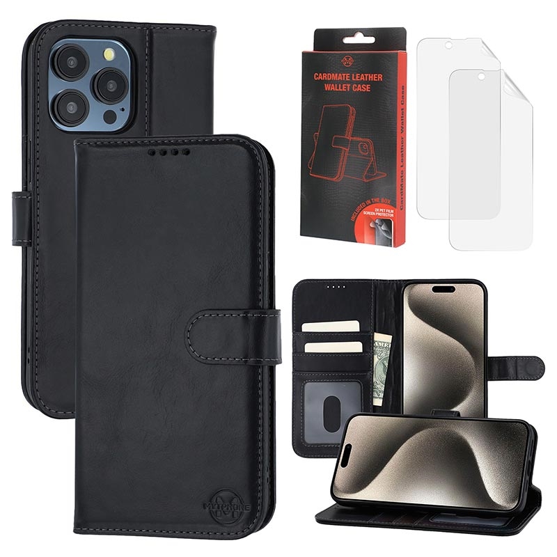 • MyTPhone CardMate Premium Leder Wallet Case für iPhone 15 Pro - Standfunktion, Kartenhalter, Unterstützung für drahtloses Laden, 2x Displayschutzfolie