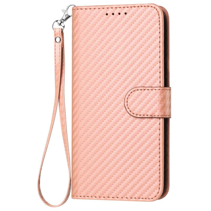 iPhone 15 Pro Max Premium Wallet Hülle mit Riemen - Kohlefaserstruktur - Carbon Pink