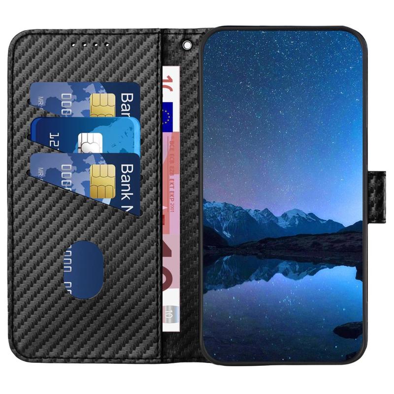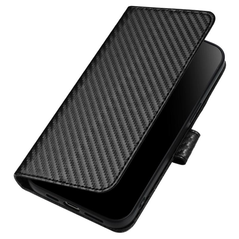 iPhone 15 Pro Max Premium Wallet Hülle mit Riemen - Kohlefaserstruktur - Carbon Schwarz