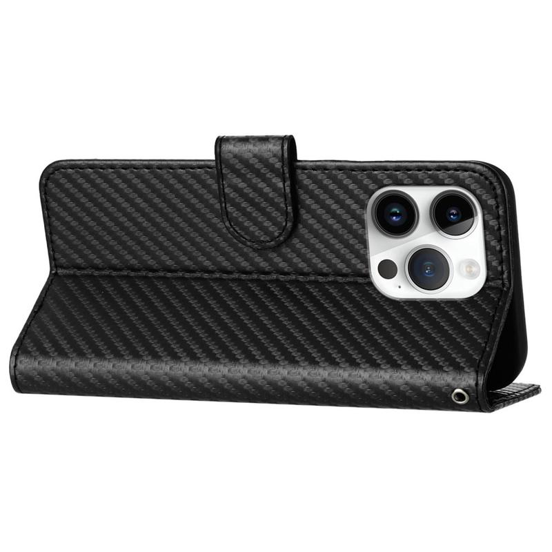 iPhone 15 Pro Premium Wallet Hülle mit Riemen - Kohlefaserstruktur - Carbon Schwarz