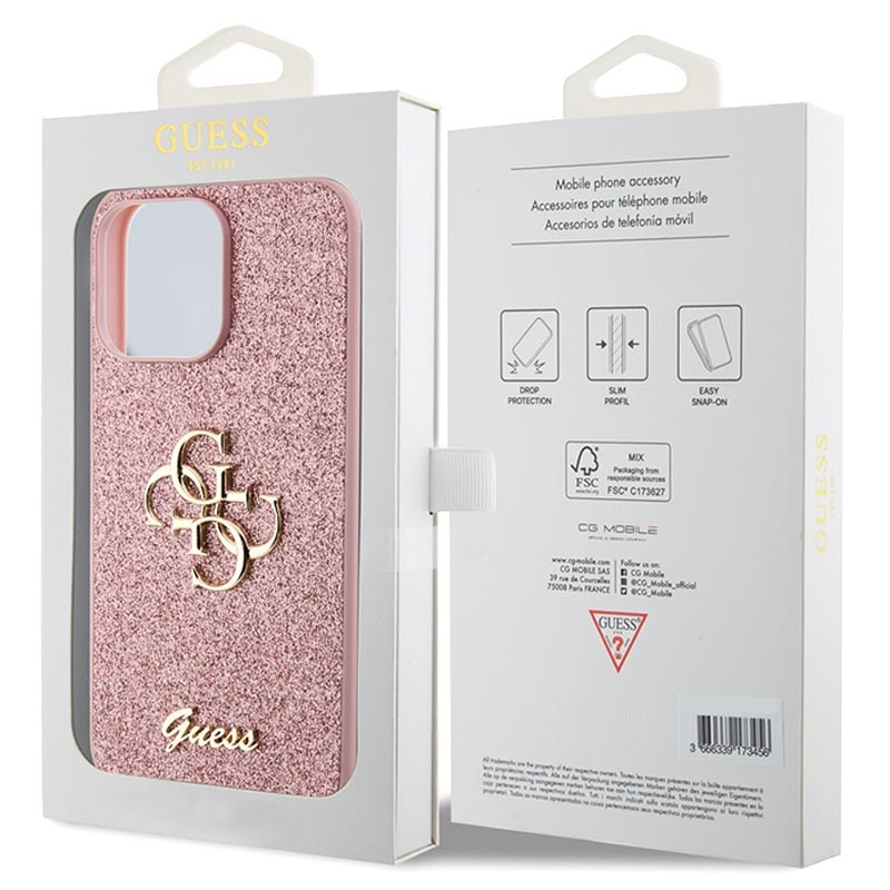- Spektakuläre Guess Fixed Glitter 4G Metal Logo-Hülle für iPhone 15 Pro Max