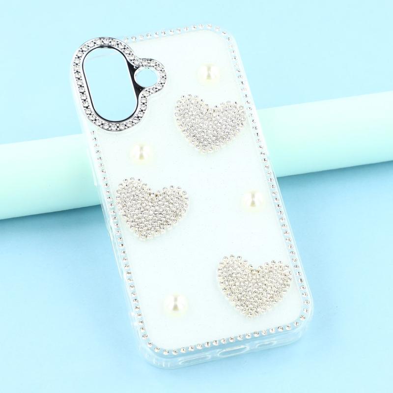 Diese iPhone 16 Hülle kombiniert zuverlässigen Schutz im Alltag mit glamourösem Stil. Mit schimmernden Strasssteinen an den Rändern und funkelnden Perlenherzen auf der Rückseite verwandelt sie dein iPhone 16 in ein modisches Accessoire und schützt es gleichzeitig vor Kratzern und Stößen.