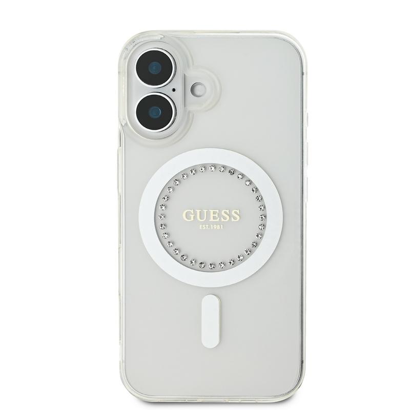 Guess IML Rhinestones Ring Hülle für iPhone 16 - MagSafe kompatibel