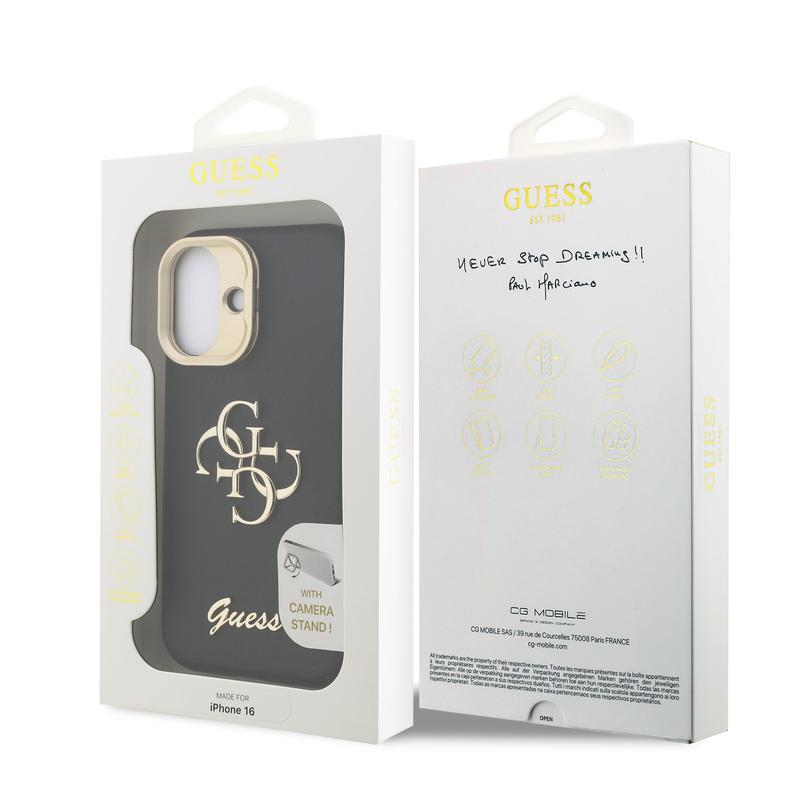 • Guess Grained 4G Logo Standkamera-Rahmengehülle für iPhone 16 - Designer Style mit Hands-Free Ease