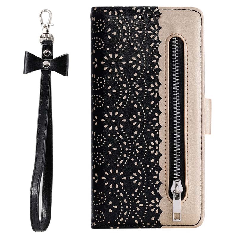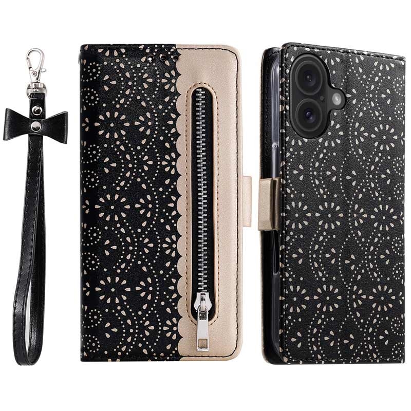 Diese unglaublich stilvolle Brieftasche mit Spitzenmuster schützt Ihr iPhone 16 Plus vor Beschädigungen, und die vordere Reißverschlusstasche bietet Platz für Papiergeld und Münzen.