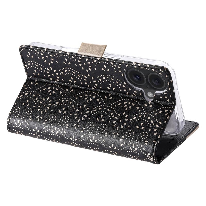 iPhone 16 Plus Lace Pattern Schutzhülle mit Geldbörse - Schwarz