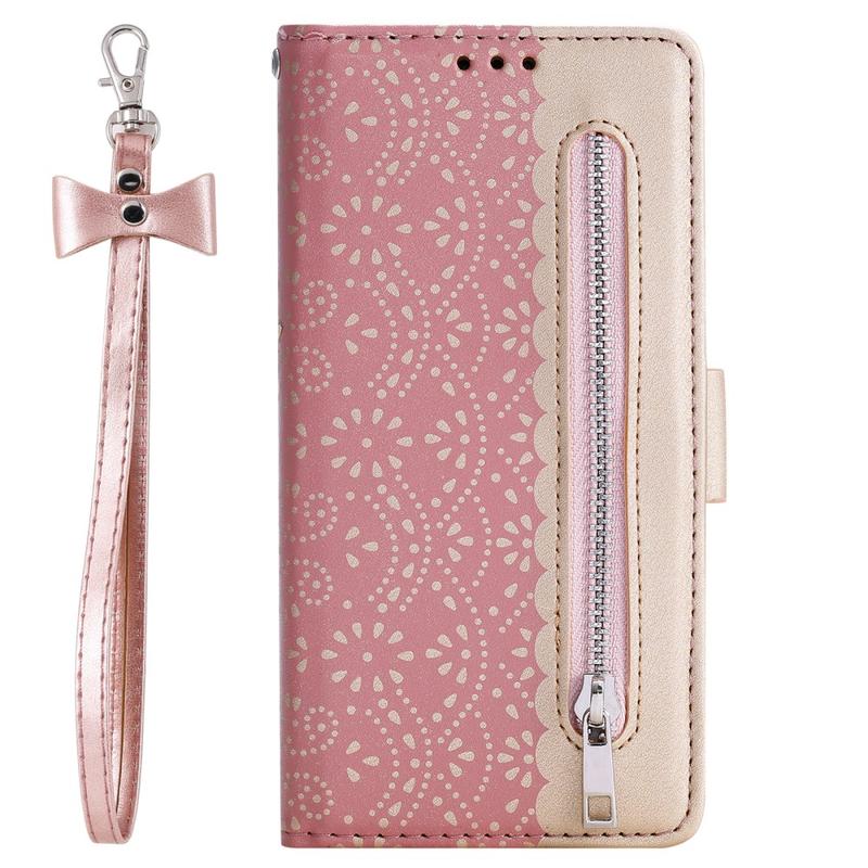 Diese unglaublich stilvolle Brieftasche mit Spitzenmuster schützt Ihr iPhone 16 Plus vor Beschädigungen, und die vordere Reißverschlusstasche bietet Platz für Papiergeld und Münzen.