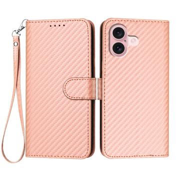 iPhone 16 Premium Wallet Hülle mit Riemen - Kohlefaserstruktur - Carbon Pink