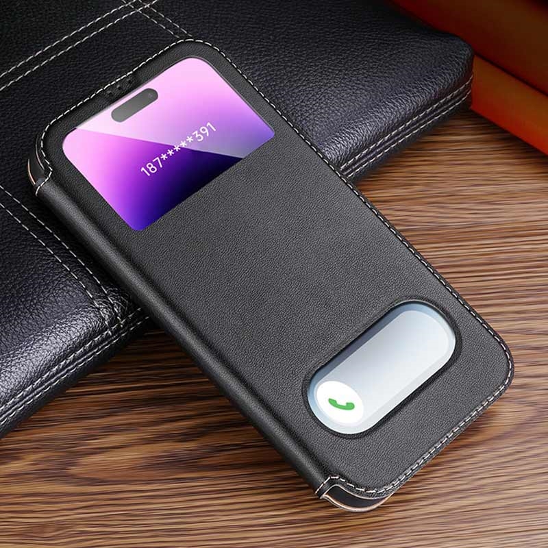 • Dual View Flip Lederhülle für iPhone 16 Pro Max