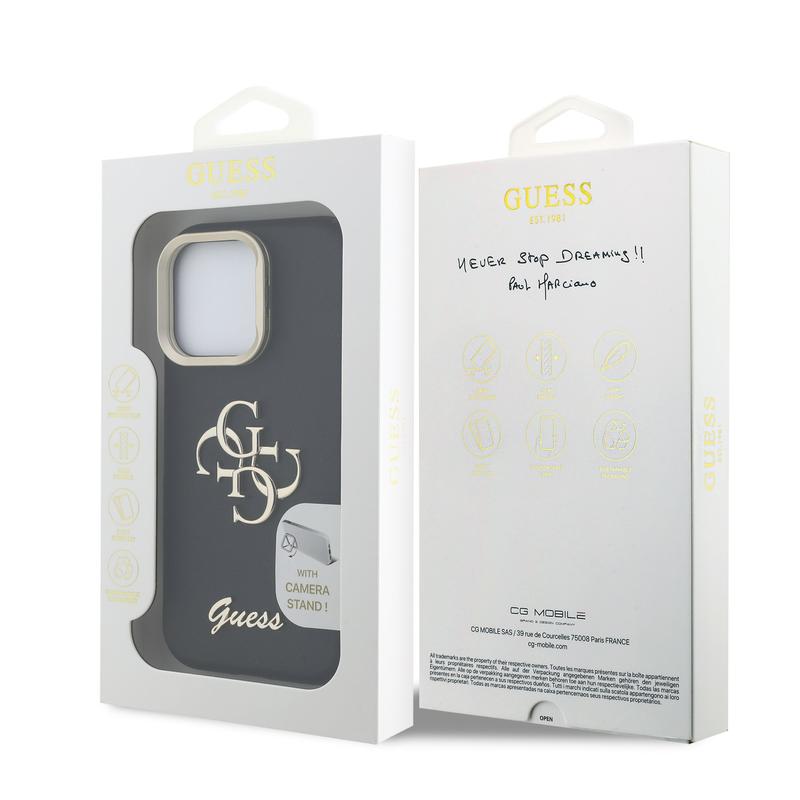 Guess Grained 4G Logo Standkamera-Rahmengehülle für iPhone 16 Pro Max - Designer Style mit Hands-Free Ease
