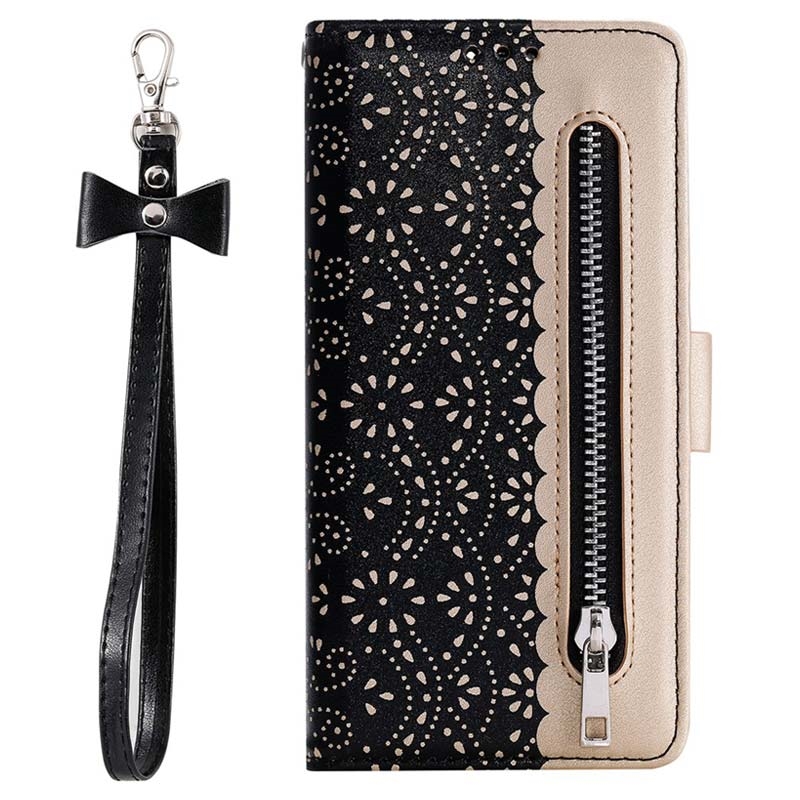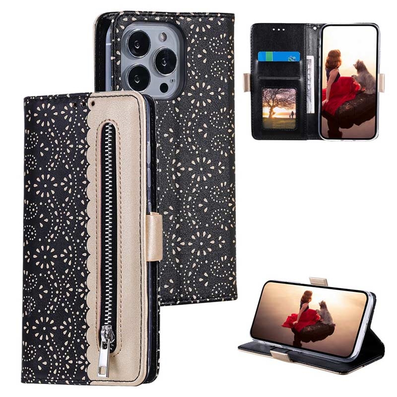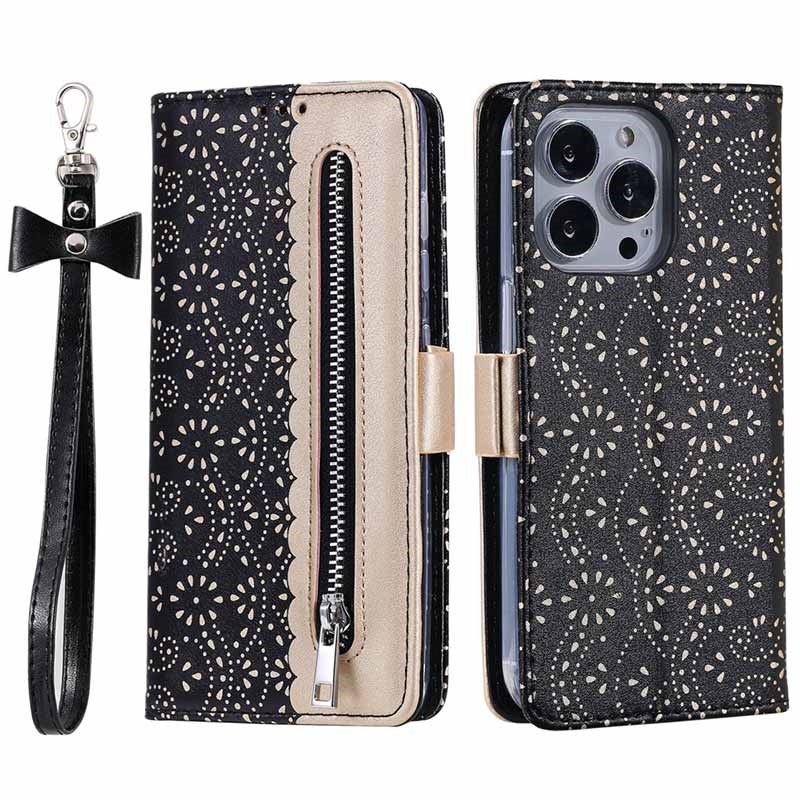 Diese unglaublich stilvolle Brieftasche mit Spitzenmuster schützt Ihr iPhone 16 Pro Max vor Beschädigungen, und die vordere Reißverschlusstasche bietet Platz für Papiergeld und Münzen.
