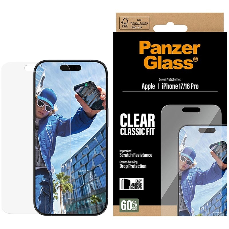 Schützen Sie Ihr iPhone 17, iPhone 16 Pro mit der PanzerGlass Classic Fit Displayschutzfolie, die Kratzern, Stößen und Stürzen standhält. Sie besteht zu 60 % aus recyceltem Glas und bietet die gleiche kompromisslose Stärke, während sie gleichzeitig zu einer nachhaltigeren Zukunft beiträgt.