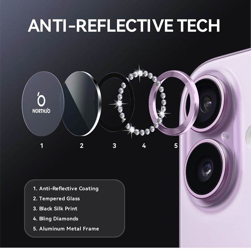 Verleihen Sie Ihrem iPhone 17 mit dem NORTHJO Kameraobjektivschutz Glanz und Schutz. Mit schimmernden Strasssteinen und präzisionsgeschliffenem, gehärtetem Glas schützt er Ihr Kameraobjektiv vor Kratzern, Staub und Stößen und verleiht ihm einen Hauch von Eleganz und Luxus.