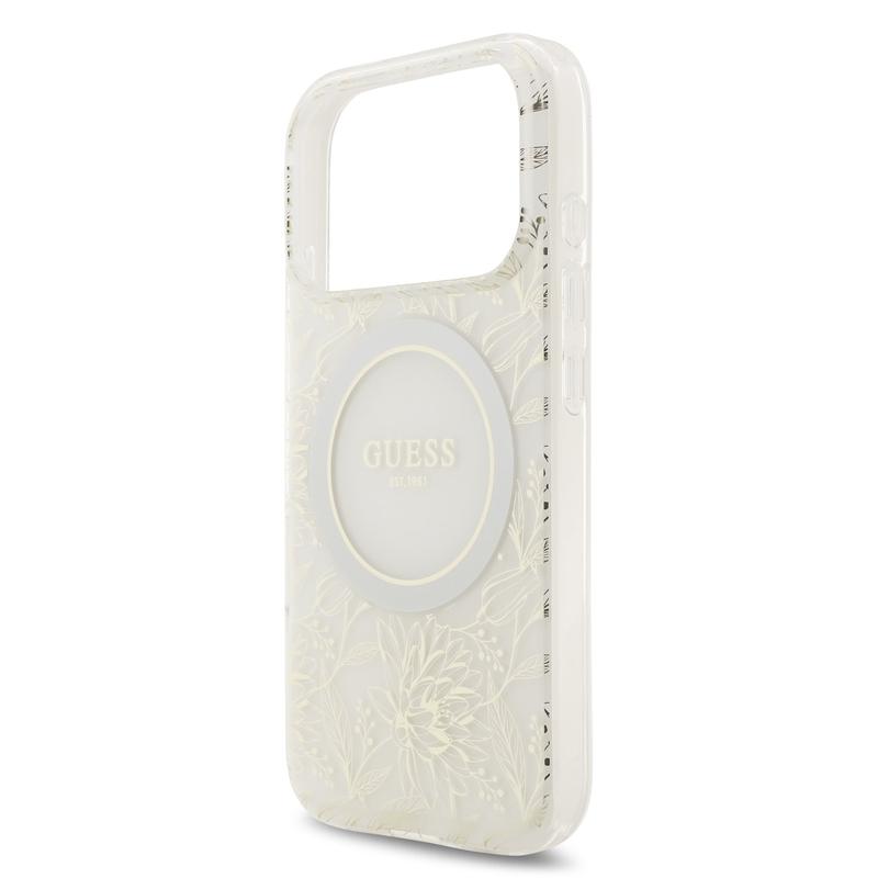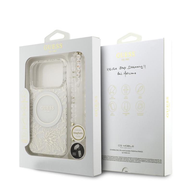 Guess IML Flowers Allover Electro Hülle mit Perle Riemen für iPhone 17 Pro - MagSafe-kompatibel