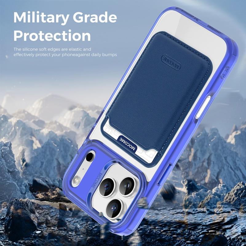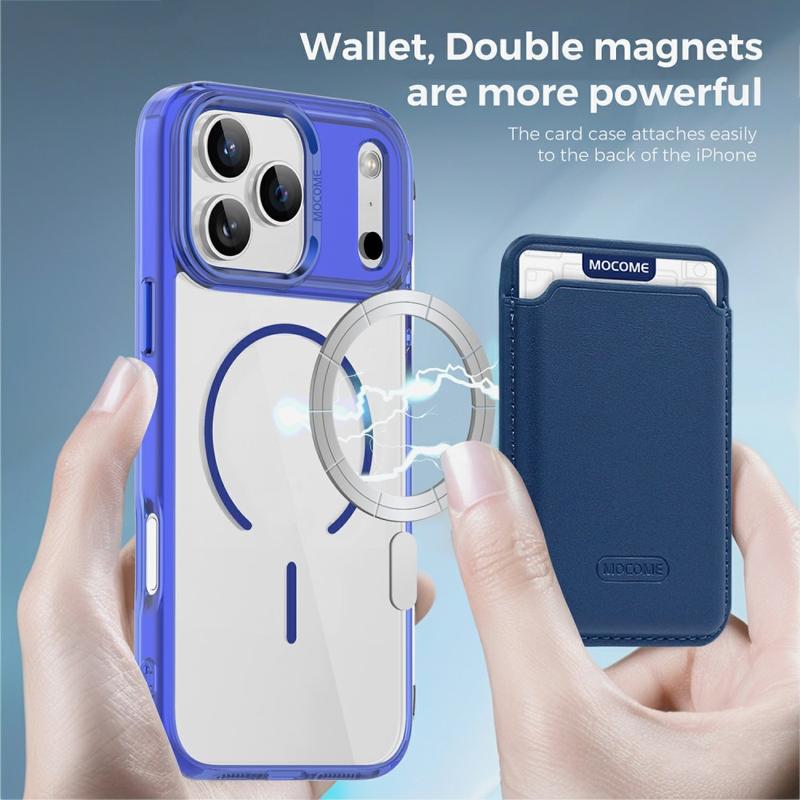 Schützen Sie Ihr Gerät stilvoll mit dem MagSafe Case für das iPhone 17 Pro, das sowohl auf Haltbarkeit als auch auf Komfort ausgelegt ist. Diese Hülle besteht aus einer Hybridkonstruktion aus TPU und PC und kombiniert Flexibilität mit Stärke, um Ihr Gerät vor Stürzen, Kratzern und täglichem Verschleiß zu schützen. Dank des integrierten Magnetrings ist sie vollständig kompatibel mit MagSafe-Ladegeräten und magnetischen Autohalterungen, während die abnehmbare, schlanke Kartentasche mit zwei Magneten das Mitführen von 1-2 Karten ermöglicht, ohne dass sie zu groß wird. Die kristallklare Oberfläche lässt Ihr iPhone 17 Pro elegant und originell aussehen, während verstärkte Ränder und erhöhte Einfassungen einen Rundumschutz für Ihr Display und Ihre Kamera gewährleisten.