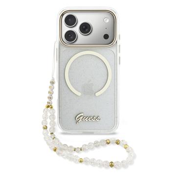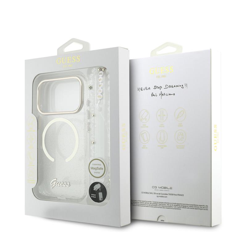 Guess IML Glitter Script Armband MagSafe Hülle für iPhone 17 Pro Max - Glitzernde Rückseite mit Handgelenkband, PC+TPU-Schutz, MagSafe-kompatibel