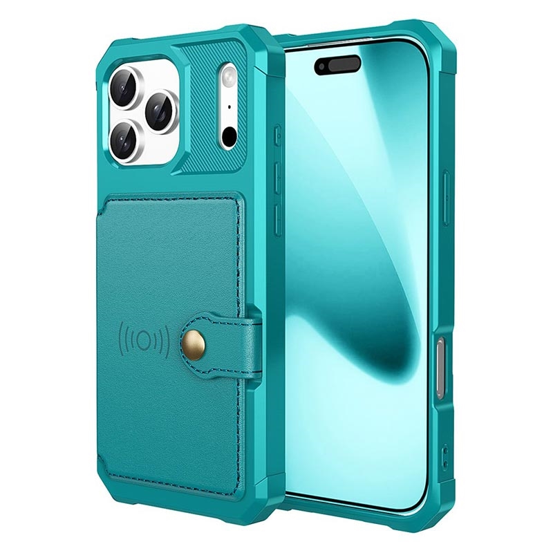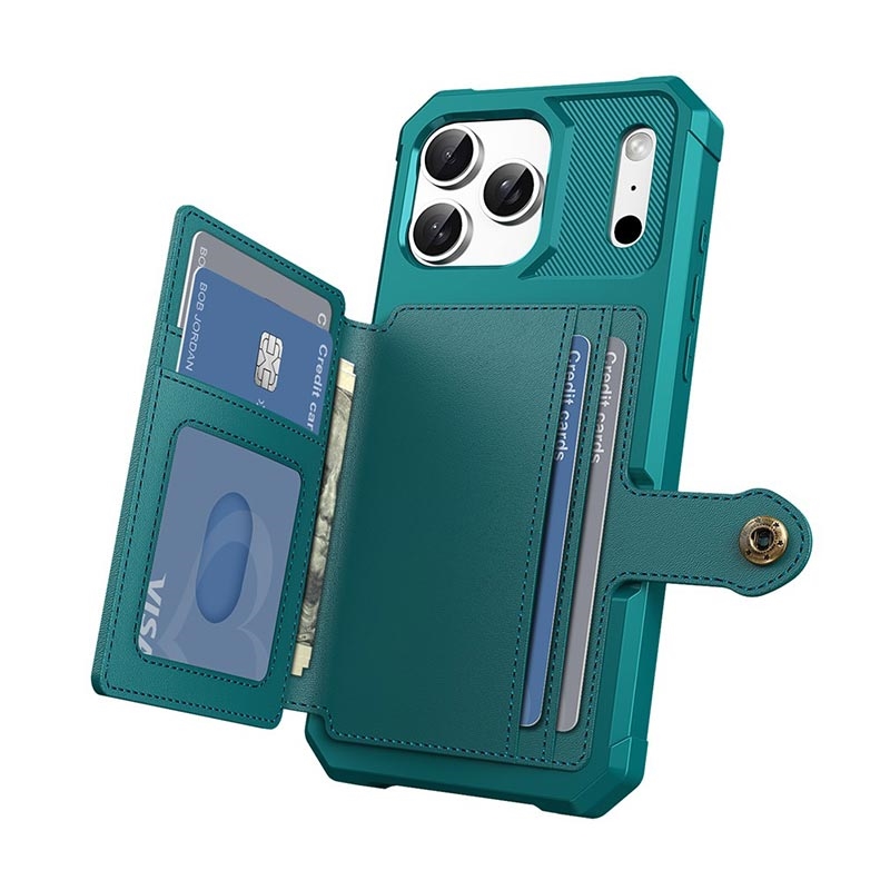 - Die Brieftaschenhülle für das iPhone 17 Pro Max verfügt über einen sicheren Druckknopfverschluss, ein Brieftaschendesign und mehrere Kartenfächer mit einer Geldtasche