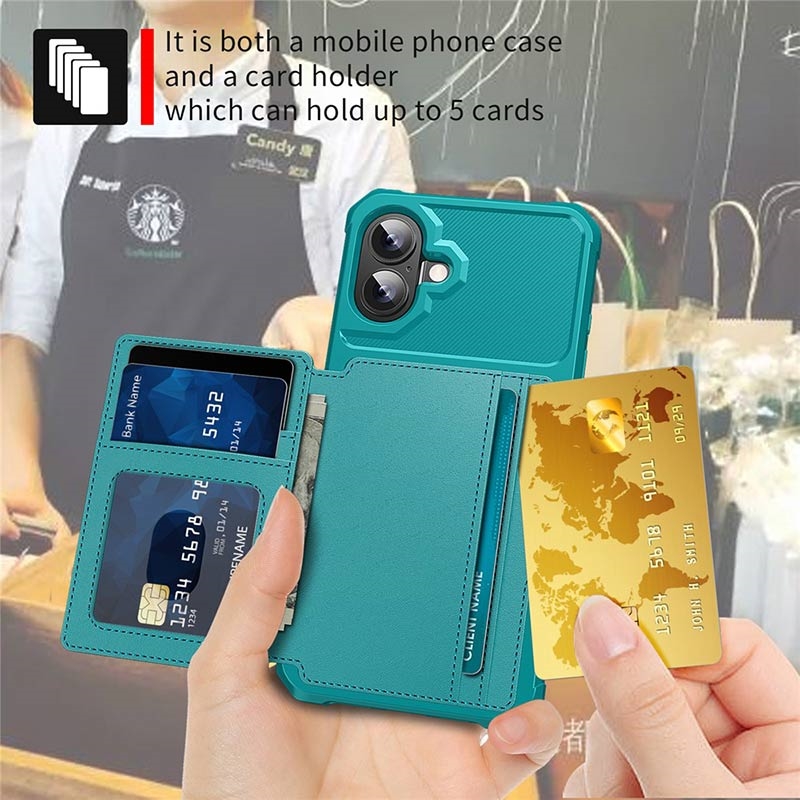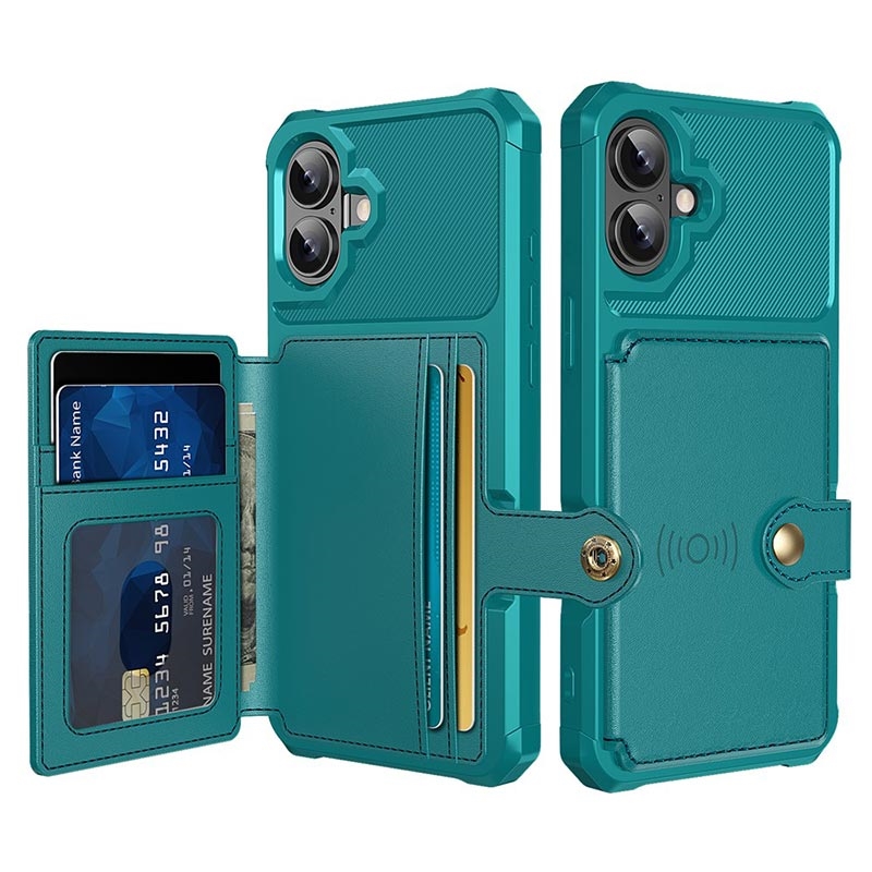 - Die Brieftaschenhülle für das iPhone 17 verfügt über einen sicheren Druckknopfverschluss, ein Brieftaschendesign und mehrere Kartenfächer mit einer Geldtasche