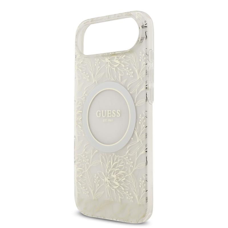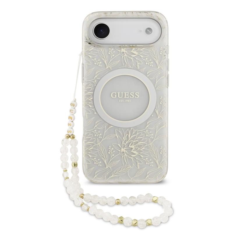 Guess IML Flowers Allover Electro Hülle mit Perle Riemen für iPhone Air - MagSafe-kompatibel