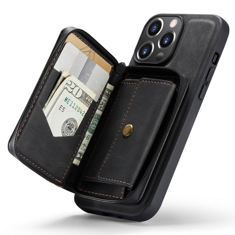• JEEHOOD Phone Case for iPhone 14 Pro Shockproof PU Leather Coated TPU Cover Phone Case with Zippered Wallet Kickstand This case features a two-in-one design with a leather wallet that can be attached together by strong magnetism, the phone case and wallet can be used individually. With 3 card slots + 2 cash pockets, this wallet looks very mini in appearance but it has a large capacity. A drop-proof phone case made of TPU coated with premium PU leather is chic and durable for use. Wireless charging won't be affected by the phone case. Made of well-selected TPU +PU leather Zipper closure, keep your cards and cash safe inside Can act as a kickstand to support your phone for hands-free viewing Enhanced corners protect your phone from drop and shock Raised lips for camera lens' 360° protection Support wireless charging without taking off the case  Note: Not support to attach to magnetic car holder.