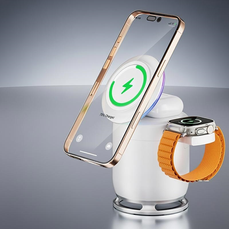 - 3-in-1-Ladung: 15W Telefon + 2,5 W Uhr + 5 W Ohrhörer gleichzeitig