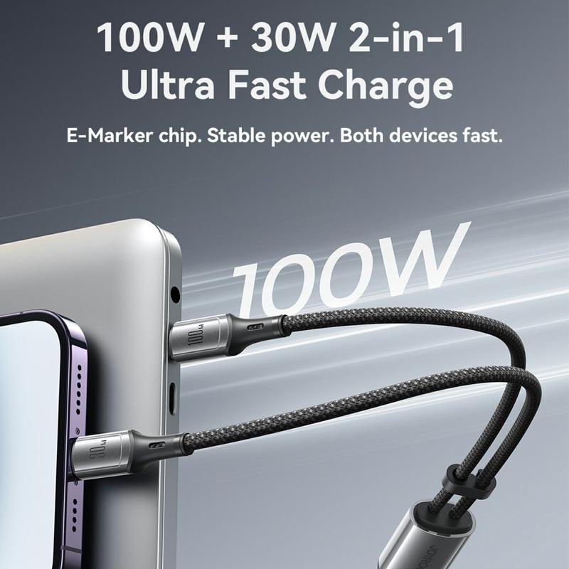 Wenn Sie es leid sind, mehrere Kabel mit sich herumzutragen, ist dieses Kabel mit zwei Anschlüssen ein praktisches Upgrade. Sie erhalten 100 W Ladeleistung für leistungsstarke USB-C-Geräte, zuverlässige Datenübertragung und eine geflochtene Konstruktion, die besser für den täglichen Gebrauch geeignet ist - ideal für zu Hause, im Büro und auf Reisen.