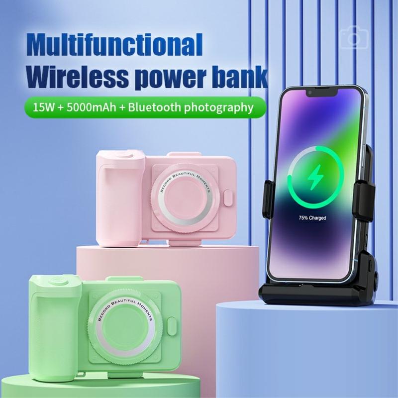 Die YR-1 3-in-1 Wireless Power Bank ist ein vielseitiges Gerät, das kabelloses Laden, eine Handyhalterung und einen Bluetooth-Kameraauslöser kombiniert. Sie verfügt über einen 5000-mAh-Akku, kabelloses Schnellladen mit 15 W und einen mechanisch verriegelnden Handy-Clip für stabiles Fotografieren. Sie ist mit verschiedenen Geräten kompatibel und enthält magnetische Typ-C- und Micro-USB-Adapter für Telefone ohne kabellose Ladefunktion.