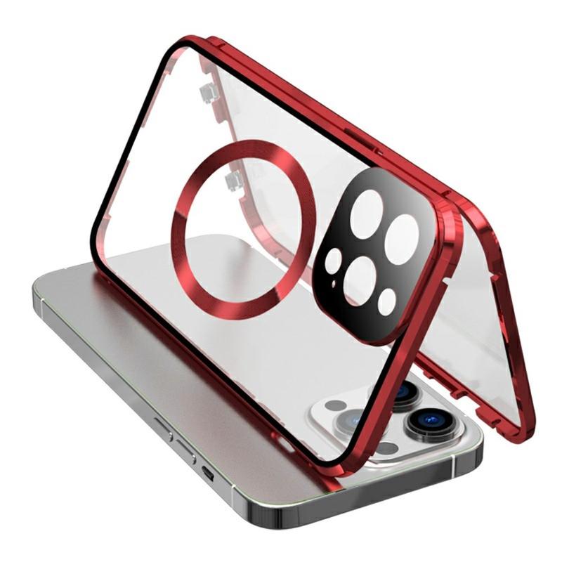 • Kompatibel mit MagSafe Case für iPhone 15 Pro Magnetischer Metallrahmen + doppelseitige Telefonabdeckung aus gehärtetem Glas mit Schnallenverschluss - Rot