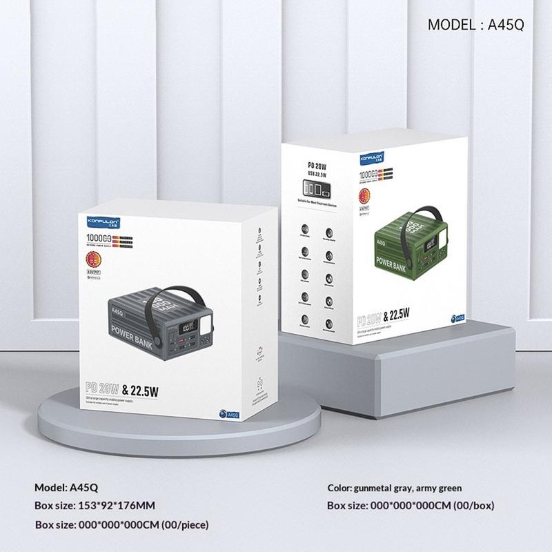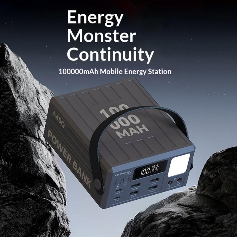 Versorgen Sie mehr Geräte länger mit Strom - mit der Konfulon A45Q Powerbank mit 100000mAh. Diese Ladestation mit hoher Kapazität wurde für Reisen, den Einsatz im Freien, Camping und als Notstromversorgung zu Hause entwickelt und bietet zuverlässige Energiespeicherung mit 7 Ausgangsanschlüssen für das bequeme Laden mehrerer Geräte gleichzeitig.