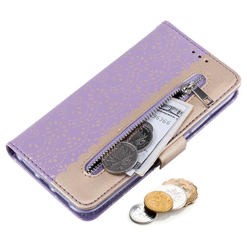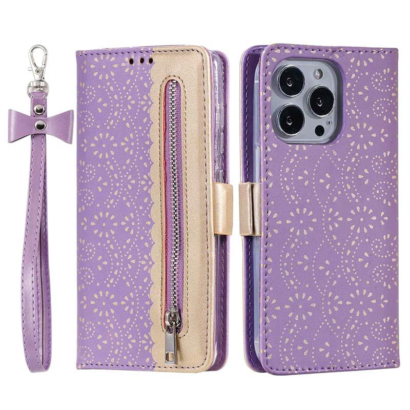 Diese unglaublich stilvolle Brieftasche mit Spitzenmuster schützt Ihr iPhone 14 Pro Max vor Beschädigungen, und die vordere Reißverschlusstasche bietet Platz für Papiergeld und Münzen.